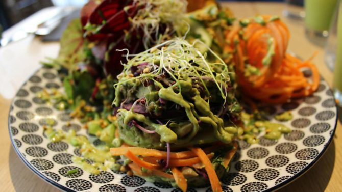 The original and the best, Le Grenier de Notre-Dame is a Paris institution. The city’s first vegetarian and macrobiotic restaurant, it opened back in 1978 – and has had the same chef, Abib, and worked with the same local growers in Northern France, ever since. Recognisable by the distinctive front windows, where verdant plants and exotic specimens dangle down from the first floor, inside it’s always packed – so book early. Offering certainly the most extensive menu of any vegetarian restaurant I’ve visited, this really is veggie heaven. L’Assiette Royale (17.95€) showcases ten different components, ranging from brown rice to seasonal vegetables to egg, avocado and soya. A riot of flavours, it’s a feast fit for a (vegetarian) king. With many of their ingredients organic and/or sourced from equitable suppliers, and plenty of vegan-friendly options too.