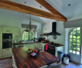 The main entrance opens onto a large open-plan living space with tiled floor, oak beams and 18th-century carved oak fireplace. Sliding doors lead to the poolside terrace, which is partly covered, creating a fabulous alfresco area with integrated barbecue.