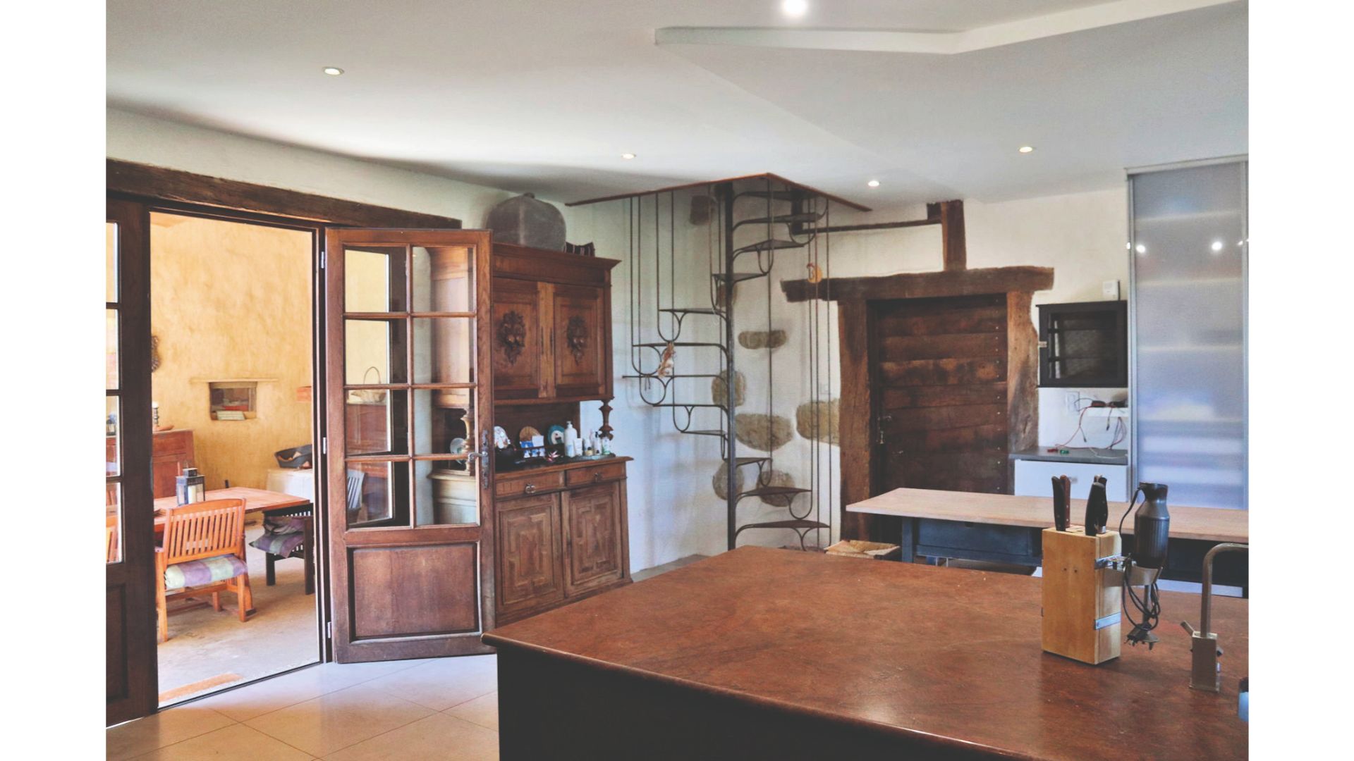 The kitchen is the pivotal point of the L-shaped house. From here you have three options. Go straight on into the long garage that runs along the back of the old porcherie. Turn left onto a covered alfresco terrace and into the ground floor of the porcherie, with its laundry and spare room. Or, climb the spiral steel staircase onto the porcherie’s upper floor where, beneath magnificent beams, a three-room master suite with covered balcony connects to a large billiards room. Then, turn a corner into the 18th-century barn, where once a family of stone-cutters lived, but today there’s an office above a workshop. You could always turn this into a second guest house, taking advantage of the balcony and mountain views. The good life indeed!