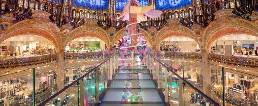 The tradition of the giant Christmas tree at Galeries Lafayette dates back to 1976, when it first graced the centre of the store’s dome. Over the years, the tree has become an iconic symbol of the holiday season in Paris, drawing locals and tourists alike to marvel at its splendour. Each year, the tree is meticulously decorated, with its design and theme carefully chosen to capture the imagination of all who behold it. As visitors gaze upon the tree, they are reminded of the enduring magic and tradition of Christmas at Galeries Lafayette.