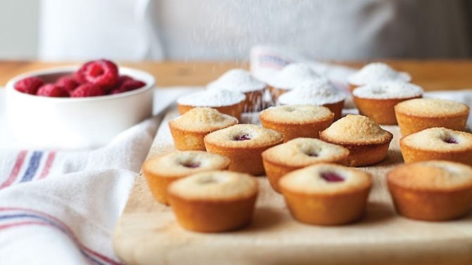 Just before you bake the financiers, cut 12 raspberries in half and place one half, cut side down, on top of each financier. Press down gently.