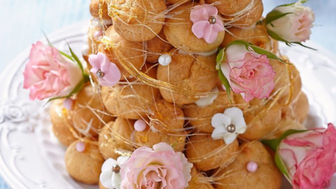 <3 The traditional wedding ‘cake’ is a pyramid tower made up of layers of small chou cakes (little round eclairs filled with crème anglaise, the yellow custard cream) held together with a coating of caramel syrup.