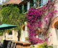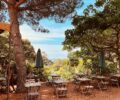 I stroll back uphill toward the Sub Tropical terrain, through tall bamboo corridors, past exotic palms and climbing plants to waterfalls where the loveliest birdsong pervades my senses. I sit beside an old stone water well, its ochre walls in harmony with the lush greenery, and inhale deeply. The woodsy scent of the forest and plants is both fresh and invigorating and conjures images of far-off places. Another steep flight of stone steps brings me to ‘La Ferme’ where the restaurant ‘Le Cafe des Jardiniers” stands, its chairs and tables gathered opposite under a canopy of netting offering shade from the fierce midday sun. Vivid magenta Bourgainvillea adorns the front archway of the restaurant, climbing up to blue wooden shutters facing splendid views of the Golden Isles of Hyeres in the distance – a group of idyllic islands of Porquerolles, Port Cros, Ile du Levant and Ice de Bagaud. I enjoy a burrata and fresh pesto salad with a glass of chilled Rose wine and review the map for later.