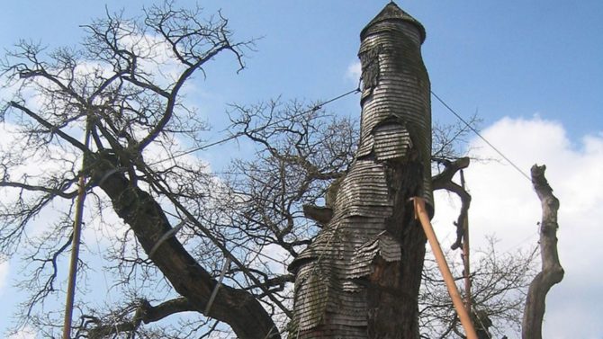 I walk round it while a couple of stooped pensioners tap past on walking sticks. The furrowed crevassed limbs of the oak are similarly supported by steel crutches and where the bark has fallen away the branches are sheathed in a protective armour of wood, shaped like roof tiles. The tree measures 16 metres in circumference at its base and 18 metres in height, with a crown of foliage studded with acorns that ripen and fall as they have for almost 1,200 years (a line-up of the oak’s ‘enfants’ are growing at the back of the church). A small turret with iron cross surmounts the main thrust of the trunk while a smaller one at a rakish tilt sits on an auxiliary branch. A wooden handrail and staircase helter-skelter upwards leading to two small chapels within the tree. Its hollowness is an indicator of great age, but it is these human interventions that make this oak particularly fascinating.