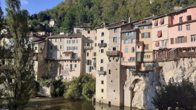 At the western end of the Gorges de la Bourne, the riverside village of Pont-en-Royans on the Isère/Drôme border in the Auvergne-Rhône-Alpes is famous for its colourful gravity-defying houses that overhang the Bourne River. In this Plus Beau Village medieval architecture attracts tourists from across the world to see these ingenious buildings that have stood the test of time.